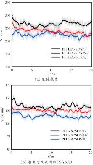 圖7 不同復配體系中表面活性劑分子的關鍵動態性質隨時間的演變曲線