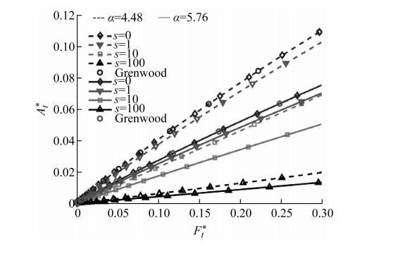 無量綱真實接觸面積At*與無量綱兩表面平均距離u的關系:兩表面間平均距離越大,真實接觸面積越小,且二者呈非線性關系。當兩表面間平均距離不變時,表面張力越大,真實接觸面積越小,這是由于表面張力的作用引起的。同理,當忽略表面張力時(s=0),其結果與Greenwood所得結果吻合。此外,當表面張力相同時,表面粗糙度較大時,真實接觸面積較小。這里由于選取的兩組表面形貌參數所對應的粗糙度相差不大,所以真實接觸面積的差別很小。