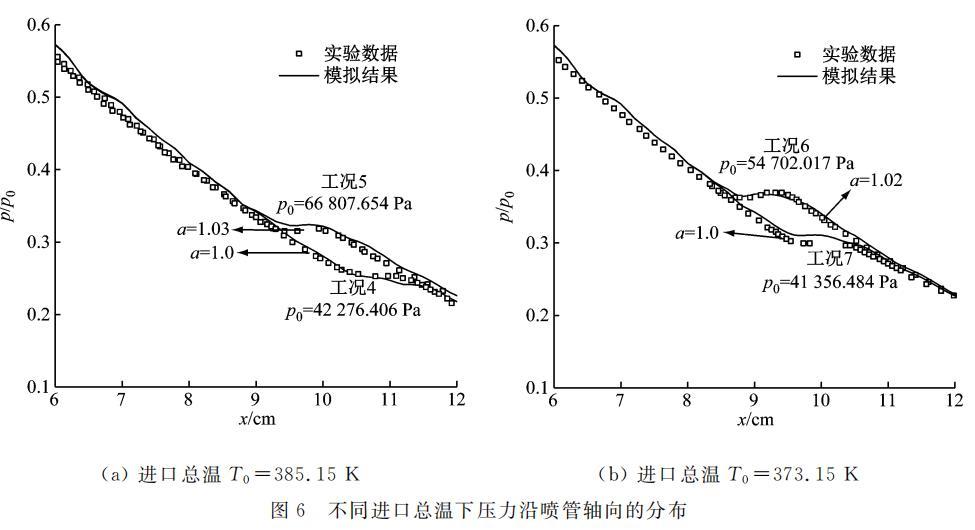 圖 5 給出了進口總壓為 70 kPa 和 42 kPa 條件下,蒸汽壓力沿噴管的軸向分布。由圖 5(a) 可知,a=1.03 時,工況 1、工況 2 模擬得出的壓力分布與實驗數據基本吻合。與圖 5(a) 相似,圖 5(b) 中當 a=1.0 時,均能獲得與實驗壓力分布基本吻合的模擬結果。對比圖 5(a) 和圖 5(b) 可知,a 的取值與進口總溫關聯較小,而與總壓有明顯的相關性。該結論從圖 6 中 2 組工況的壓力分布曲線可進一步證實。在相同的進口總溫下,隨著總壓的下降,對應的表面張力修正系數最佳取值分別從 1.03 和 1.02 下降到 1.0。對于以上 7 個工況的預測,其蒸汽壓力陡升程度與實驗數據相吻合,蒸汽凝結位置與實驗數據的相對誤差也均小于 2%,在可接受范圍內。