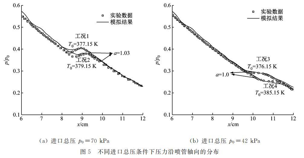 圖 5 不同進口總壓條件下噴管軸向壓力分布