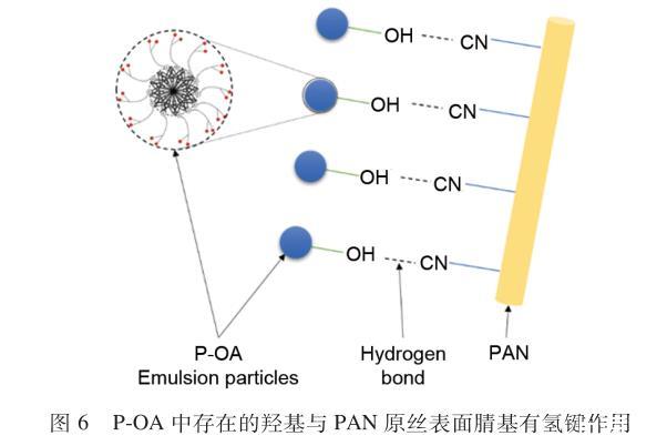 在炭纖維生產過程中油劑是減少表面缺陷的有效措施。本文設計合成的HA-PDMS,分子兩端有3個羥基,容易與PAN原絲表面腈基(-CN)形成氫鍵(圖6),有利于增加PAN原絲集束性。對P-PAN和J-PAN的性能進行了測試,由表2可知,P-PAN強度較J-PAN提高4.6%,斷裂伸長率、纖度、模量、抗摩擦系數以及變異系數與J-PAN相當。