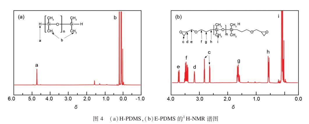 利用1H-NMR對H-PDMS和E-PDMS的形成進行結構表征,如圖4(a)所示,a處的位移(4.57)歸屬為Si-H上的氫,b處的位移(0.08)歸屬為Si-CH3上的氫,證明了H-PDMS已經合成。如圖4(b)所示,c、d處的位移(2.61~2.80、3.15)分別歸屬為環氧基團上的氫,e、f處的位移(3.70、3.36)分別歸屬為醚鍵兩端的氫,g、h處的位移(1.62、0.57)歸屬為—CH2—上的氫,i處的位移(0.08)歸屬于Si-CH3上的氫,證明了E-PDMS已經合成。