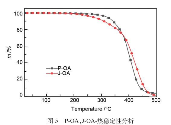 纖維上油后需要進行預氧化和炭化,因此要求油劑具有適中的耐熱性,在200~300℃預氧化過程中不分解,不揮發,以保持纖維不黏連和并絲,但在300~800℃低溫炭化過程中迅速氣化,完全分解,盡量降低炭纖維灰分含量。圖5為P-OA與J-OA的熱穩定性曲線。油劑分解20%時,P-OA的分解溫度比J-OA高,油劑分解25%時兩條曲線相交,分解溫度為378℃。結果表明,P-OA的耐熱穩定性在300℃較J-OA高,滿足炭纖維原絲炭化生產要求。