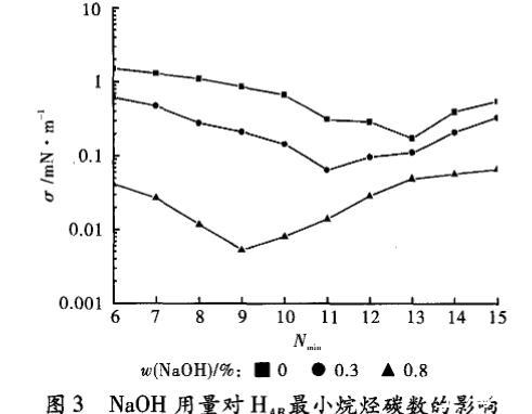 由圖3可知,隨著堿用量的增加,HAB溶液的Nmin值從13變為9,Nmin與EACN的比值從13/9變到1,即Nmin與EACN的比值更接近1,相應的界面張力也變得更低。對于混合表面活性劑體系來說,Nmin值雖然宏觀上表現出一個值,而實質上是通過組成此混合表面活性劑體系中幾種表面活性劑的Nmin值通過計算平均值得到的。實驗中所用到的重烷基苯磺酸鈉是一種混合表面活性劑,主要是由單烷基苯磺酸鈉、二烷基苯磺酸鈉、多烷基苯磺酸鈉以及烷基萘磺酸鈉等幾種磺酸鹽表面活性劑組成的,因此可以推斷出,堿的加入改變了實驗中表面活性劑HAB中每種表面活性劑的Nmin值,HAB溶液的Nmin值也就發生了變化,當堿的質量分數為0.8%時,HAB溶液的Nmin值變為9,如圖1所示,HAB溶液與直餾柴油間的界面張力達到超低。