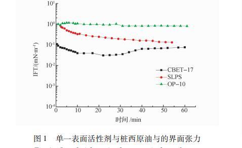 可以看出,三種表面活性劑降低油水界面張力的能力從強到弱為CBET-17>SLPS>OP-10。SLPS和OP-10與樁西原油的界面張力均在 1×10-1 mN/m,界面張力較高,不適合單獨作為驅油用表面活性劑。CBET-17與樁西原油界面張力瞬時可達3×10-2 mN/m,但維持超低界面張力的時間很短,為了找到更好的能降低油水界面張力的表面活性劑體系,建議加入堿,提高其效果。