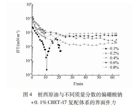 圖4 0.1% CBET-17/不同濃度偏硼酸鈉復配體系與樁西原油的界面張力