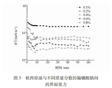 以模擬地層水配制偏硼酸鈉溶液,測定了不同質量分數的偏硼酸鈉與樁西原油的動態界面張力,結果見圖3。從圖3可以看出,當偏硼酸鈉溶液質量分數一定時,隨著時間的延長,偏硼酸鈉/樁西原油體系的動態界面張力呈現出先降低后平穩的變化趨勢。其中,0.4%濃度體系的界面張力最低可達到1.9×10-2 mN/m,然后界面張力上升,平衡界面張力在2.6×10-2 mN/m左右;偏硼酸鈉質量分數在0.2%~0.8%范圍內時,該體系平衡界面張力均在1×10-1 mN/m以下。綜上,偏硼酸鈉與地層水有很好的配伍性,且與原油界面張力效果表現較好。作為一種耐垢堿,偏硼酸鈉是良好的堿驅用劑。