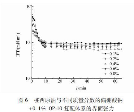 圖6 0.1% OP-10/不同濃度偏硼酸鈉復配體系與樁西原油的界面張力