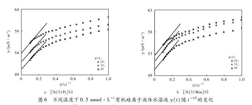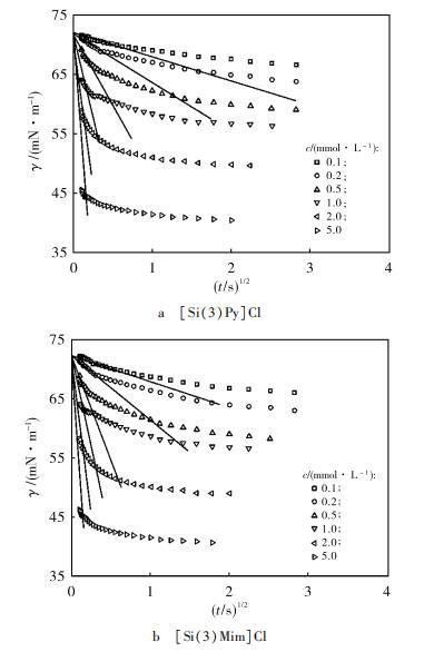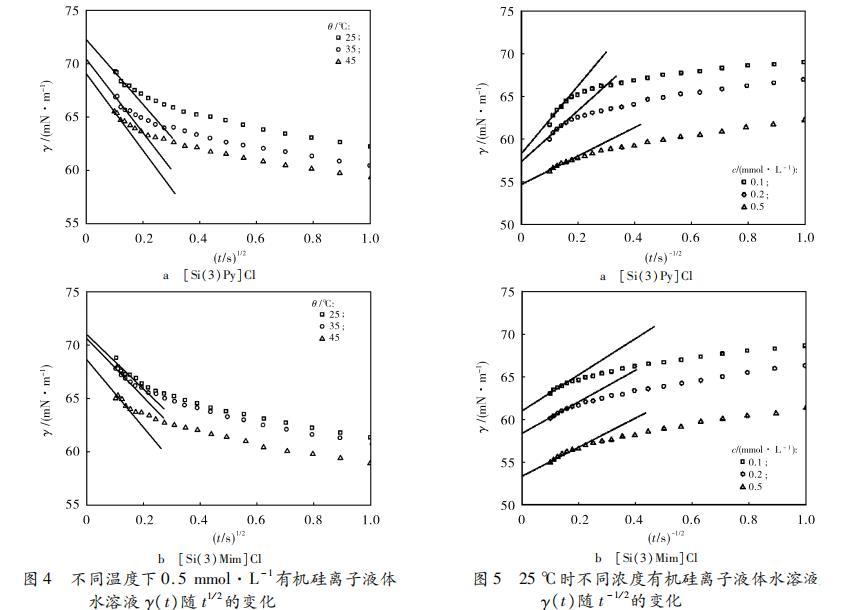 從圖3可知,對于[Si(3)Py]Cl和[Si(3)Mim]Cl水溶液,在濃度為0.1,0.2和0.5 mmol·L?1時,γ(t)與t1?2均在吸附初始階段呈線性關系。在濃度為1,2和5 mmol·L?1 2種溶液的γ(t)與t1?2在吸附初始階段內卻不能用式(4)進行擬合。測定值顯示,1,2和5 mmol·L?1 [Si(3)Py]Cl和[Si(3)Mim]Cl水溶液在儀器初始測量時表面張力已經小于65 mN·m?1,這表明此時吸附層中已經含有一定量有機硅離子液體分子。公式(3)是在假設吸附層作為稀溶液的情況下才成立的。此時高濃度情況下致使式(3)出現偏差,從而導致式(4)也不再適用。根據之前的研究,1,2和5 mmol·L?1 [Si(3)Py]Cl和[Si(3)Mim]Cl水溶液不能用式(4)擬合的主要原因可能是溶液表面中已經吸附的有機硅離子液體分子形成了雙電子層結構,該雙電子層結構產生的表面電荷成為吸附勢壘,從而影響了動態吸附過程。