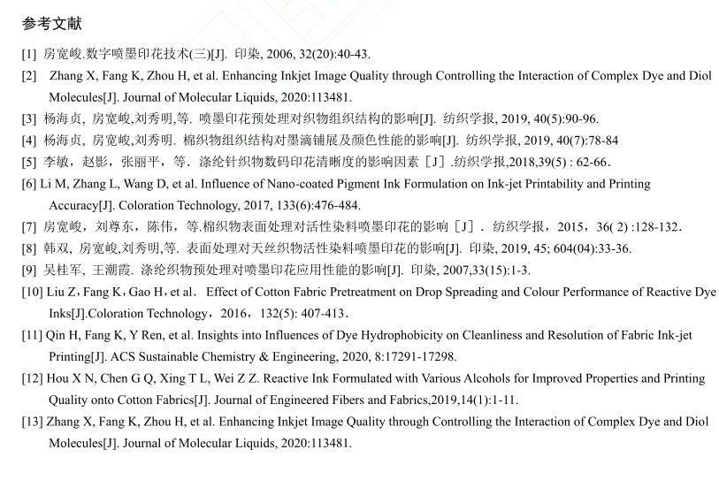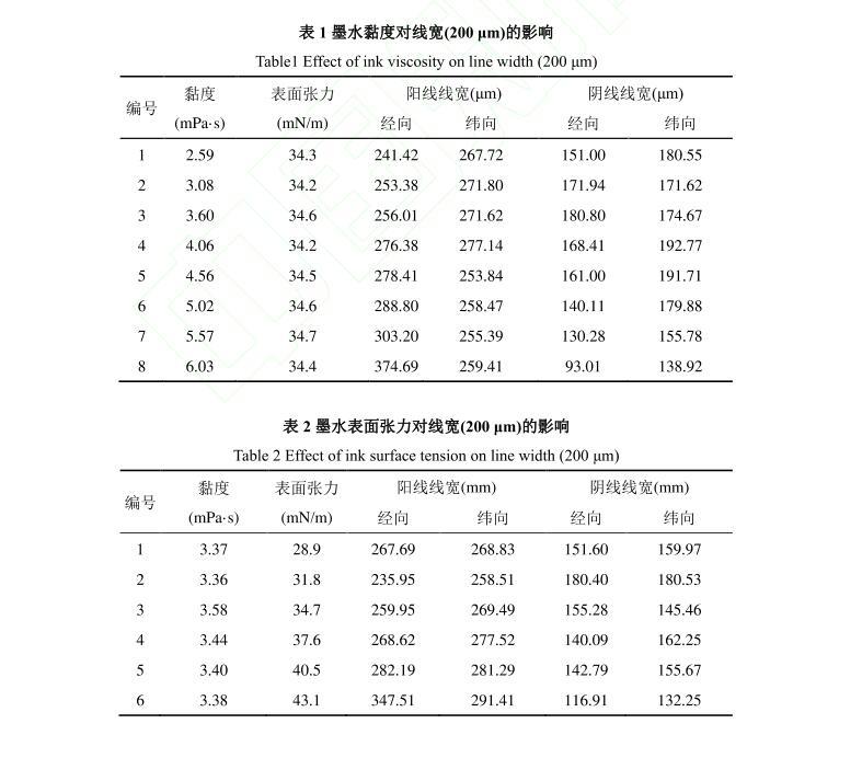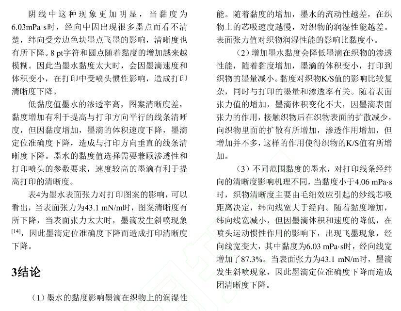 【摘要】:為了研究活性染料墨水黏度和表面張力對(duì)棉織物印花性能的影響,配制不同黏度和表面張力的活性紅墨水,測(cè)試打印后織物的滲透率、K/S值、墨量及打印線寬等指標(biāo)。結(jié)果表明:提高墨水黏度會(huì)降低墨滴在織物上的潤(rùn)濕和滲透性能,打印到織物的墨量減少,打印清晰度下降。不同黏度的墨水對(duì)打印線條經(jīng)緯向的清晰度影響機(jī)制不同,表面張力對(duì)織物打印性能的影響比黏度小。