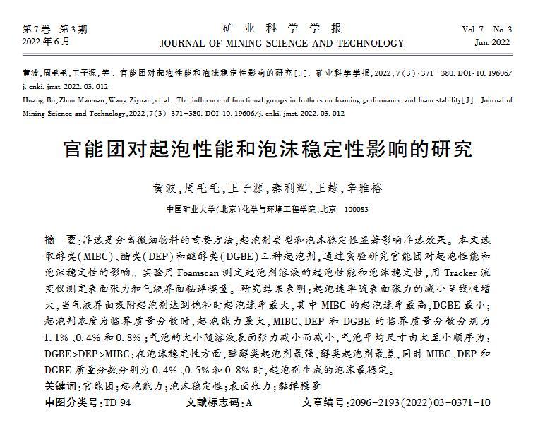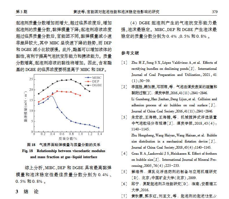 【摘要】:浮選是分離微細(xì)物料的重要方法,起泡劑類型和泡沫穩(wěn)定性顯著影響浮選效果。本文選取醇類(MIBC)、酯類(DEP)和醚醇類(DGBE)三種起泡劑,通過實(shí)驗(yàn)研究官能團(tuán)對起泡性能和泡沫穩(wěn)定性的影響。實(shí)驗(yàn)用Foamscan測定起泡劑溶液的起泡性能和泡沫穩(wěn)定性,用Tracker流變儀測定表面張力和氣液界面黏彈模量。研究結(jié)果表明:起泡速率隨表面張力的減小呈線性增大,當(dāng)氣液界面吸附起泡劑達(dá)到飽和時(shí)起泡速率最大,其中MIBC的起泡速率最高,DGBE最小;起泡劑濃度為臨界質(zhì)量分?jǐn)?shù)時(shí),起泡能力最大,MIBC、DEP和DGBE的臨界質(zhì)量分?jǐn)?shù)分別為1.1%、0.4%和0.8%;氣泡的大小隨溶液表面張力減小而減小,氣泡平均尺寸由大至小順序?yàn)椋篋GBEDEPMIBC;在泡沫穩(wěn)定性方面,醚醇類起泡劑最強(qiáng),醇類起泡劑最差,同時(shí)MIBC、DEP和DGBE質(zhì)量分?jǐn)?shù)分別為0.4%、0.5%和0.8%時(shí),起泡劑生成的泡沫最穩(wěn)定。