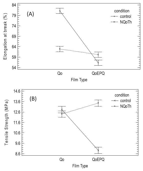 圖5.Type Film和NQoTh之間的相互作用(A)斷裂伸長率效應和(B)拉伸強度效應。