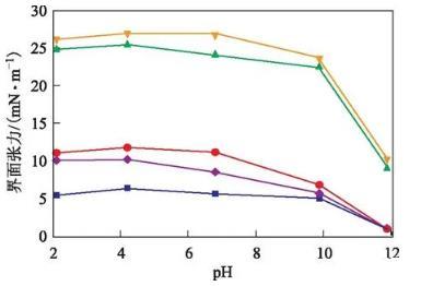 圖3pH對油水界面張力的影響飽和分;▲—芳香分;●—膠質;■—瀝青質;◆—380號燃料油